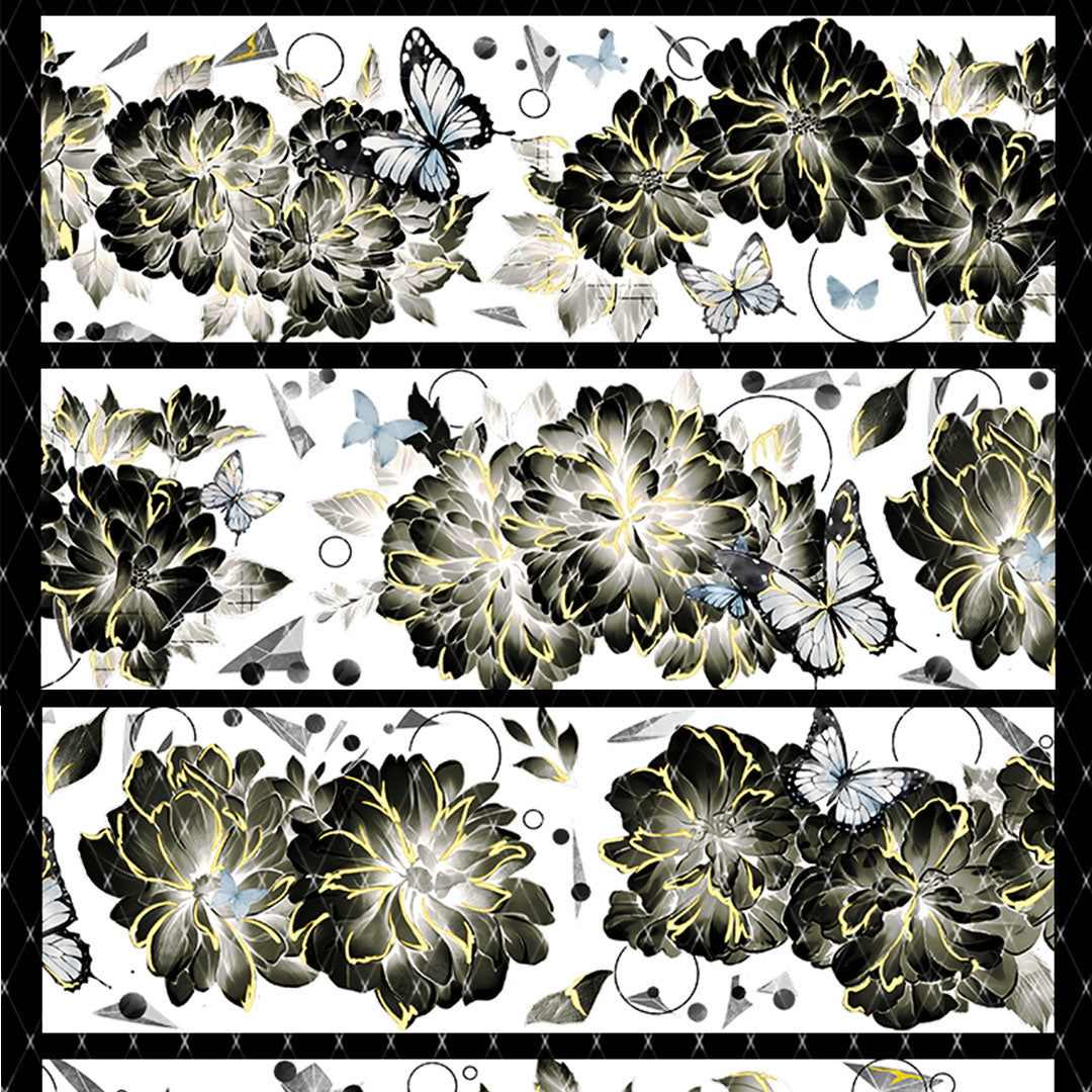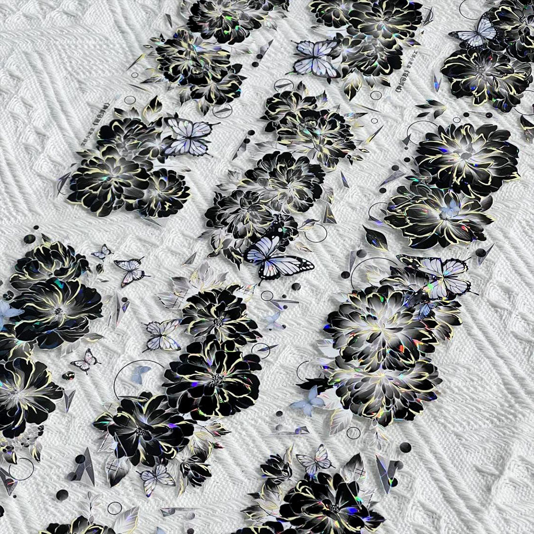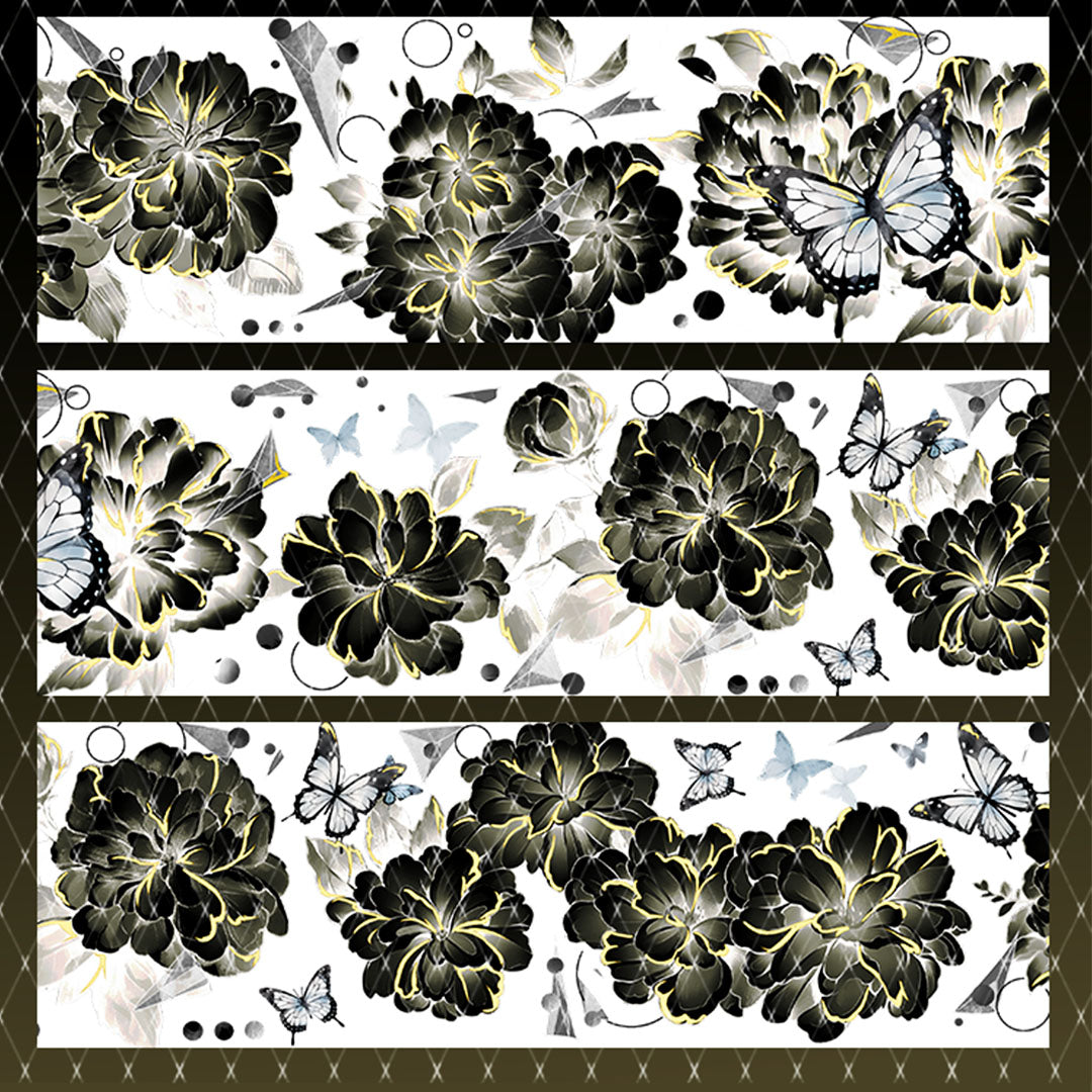 Crystal glossy tapes, shell shiny cover, black flowers with a butterfly.